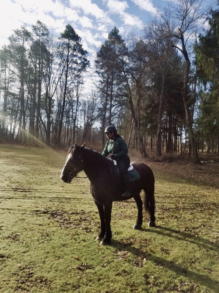 laps around us. I got off of Apollo feeling defeated and weak and on my drive home the only thought that went through my mind was, “Maybe I’m just a shitty rider and this sport isn’t for me.” Never one to throw in the towel too quickly, I watched as many training videos as I could find and made a plan. Fast forward to a few months later, four of us volunteers at the barn I worked at took our horses out on the trails. The horses were all a bit energetic, so we picked up a slow steady trot. One of the Connemara ponies in front took off in a complete gallop and all of the horses got riled up. Apollo dropped his head and gave a few good kicks and head shakes in excitement, unseating me in the process. With one foot out of the stirrup and my body leaned completely to the left, I was one solid buck away from coming off. I gathered my reins, found my stirrup, laughed out loud, and pushed him into the canter. It was one of the most exciting rides we had. Only after we got everything under control and back to the barn did I realize I wasn’t shaking and I wasn’t scared – I was excited and I had had fun! The time I took to address my fear, build a bond between my horse and I and to push myself made all the difference.